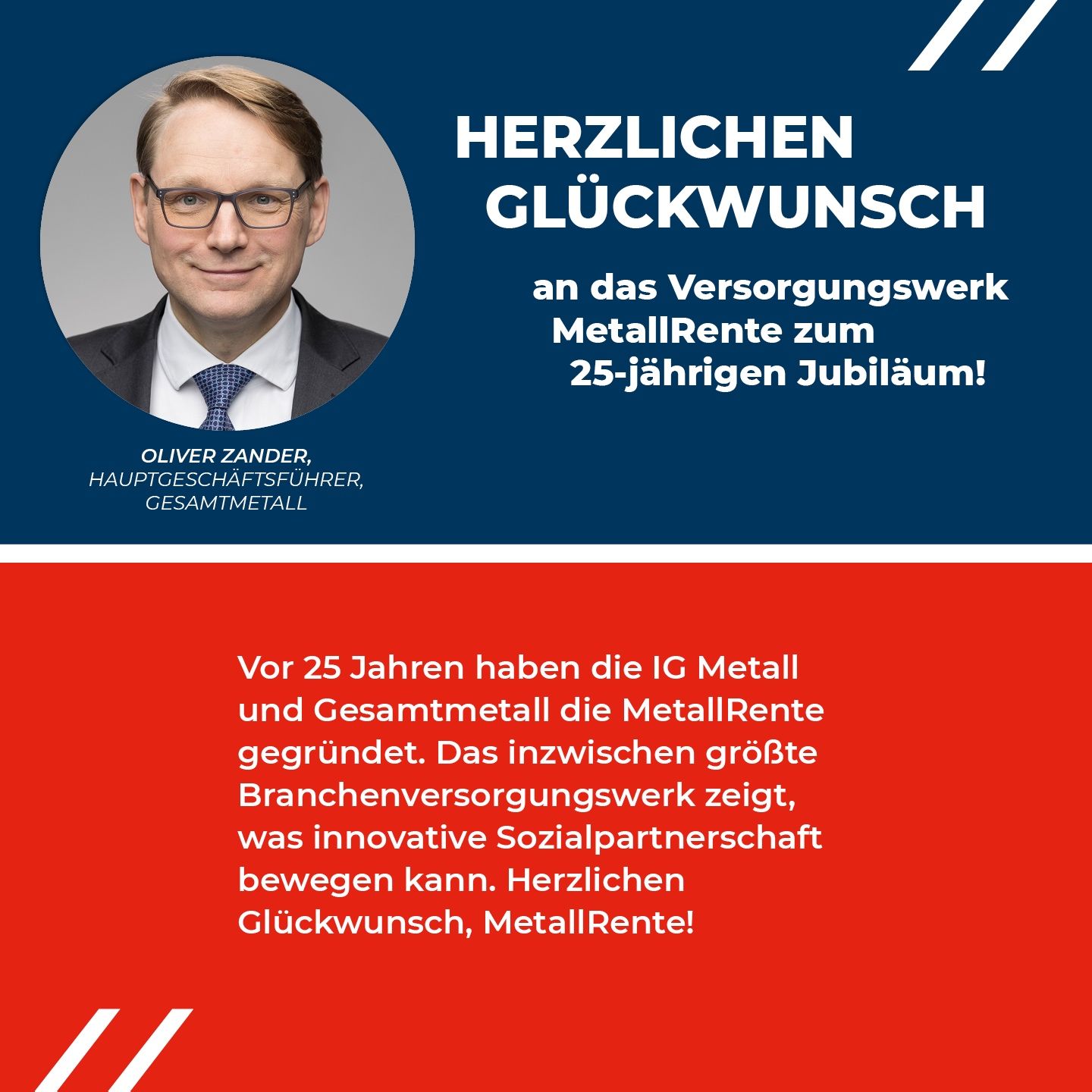 Gesamtmetall ist der Dachverband der Arbeitgeberverbände der M+E-Industrie mit Sitz am Potsdamer Platz in Berlin. Die Metall- und Elektro-Industrie ist die Schlüsselbranche Deutschlands mit über 25.000 Betrieben und rund 3,9 Millionen Beschäftigten.